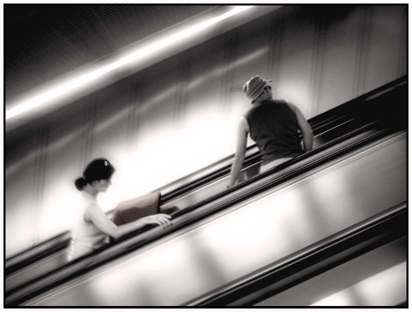 User's short description: Gesehen in Wien in einer U-Bahnstaion. Ich bin mit meiner Kamera paralel zu diesem Pärchen mit Kinderwagen auf einer Rolltreppe gefahren. Mir gefiel das Motiv sofort und hielt es mit der Kamera fest. Fuji Finepix A 202, Automatik ohne Blitz. Am Pc in sw umgeandelt.
