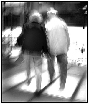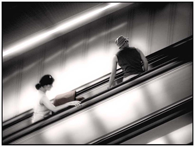 Peter Kaersch hat in seinen fotografischen Arbeiten einen deutlich spürbaren eigenen Stil entwickelt und konsequent durchgehalten. Wichtigstes Mittel dazu ist ihm die Verwendung von Bewegungsunschärfe und die Umsetzung in den Schwarz/Weiß-Modus. Beide Methoden haben sehr erfolgreich eine deutliche Verdichtung der Bildaussage zum Ergebnis. Die Umwandlung in Schwarz/Weiß führt zu einer spürbaren Intensivierung des Ausdrucks, weil das Bild unabhängig wird von der zufälligen Farbigkeit der Dinge. Ich muss zugeben, ich habe diesbezüglich dem Nutzer des PhotoTutors einen gewissen Vorteil: ich kann die von Ihnen eingeschickten Fotografien in einem Programm öffnen, welches mir neben der eingesandten Version des Bildes auch das ursprüngliche Foto anzeigt — so wie es aufgenommen oder eingescannt wurde - vor jeder Bearbeitung in einem digitalen Bildbearbeitungs-Programm. Da erkenne ich zum Beispiel, dass die Frau auf der Rolltreppe ein hellblaufarbenes Kleid trägt und der Kinderwagen eine rötlich braune, fast orange Farbe hat. Das kann man nicht gerade als ideale und harmonische Farbkombination bezeichnen. Natürlich hat der Fotograf bei diesen Aufnahmen, sofern er sie nicht selbst inszeniert, nicht wirklich einen Einfluss auf solche unglücklichen Farbzusammenstellungen. Durch die Schwarz/Weiß-Wiedergabe geht er aber vielen dieser Probleme aus dem Wege. Und nach wie vor wirkt ein Schwarz/Weiß-Foto oft sehr viel intensiver und aussagekräftiger als ein gleiches in farbiger Darstellung, wahrscheinlich weil es uns mehr Raum lässt für eigene Interpretationen und Phantasien. Es bleibt lediglich die Frage, warum dann nicht gleich in diesem Modus fotografiert wird.