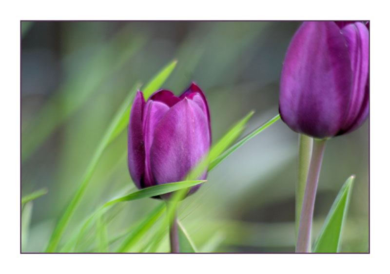 Die Fotografin hat ihr Motiv mit sparsamsten Mitteln angelegt. Eigentlich besteht es aus lediglich zwei Elementen, den Tulpen mit den paar Blattspitzen und dem im extremen Unschärfebereich gelegenen Hintergrund. Dieser Hintergrund ist wegen der Unschärfe so gering detailliert, dass seine Wesensart nicht mehr erkennbar und zu identifizieren ist. Er könnte also sowohl zufällig dort vorhanden sein, als auch ganz gezielt für diese Aufnahme gestaltet. Im Prinzip ist diese Frage aber eigentlich gar nicht relevant. Entscheidend ist vor Allem, dass die überaus große räumliche Tiefe des Hintergrunds dazu verhilft, die Tulpen als Hauptelemente des Motivs ganz klar und solitär darzustellen. Darüber hinaus unterstützen die im Hintergrund diagonal angeordneten Teile, welche schon beinahe wie von Bewegungsunschärfe verrissen erscheinen, die Form und die Anordnung der grünen Tulpenblätter.